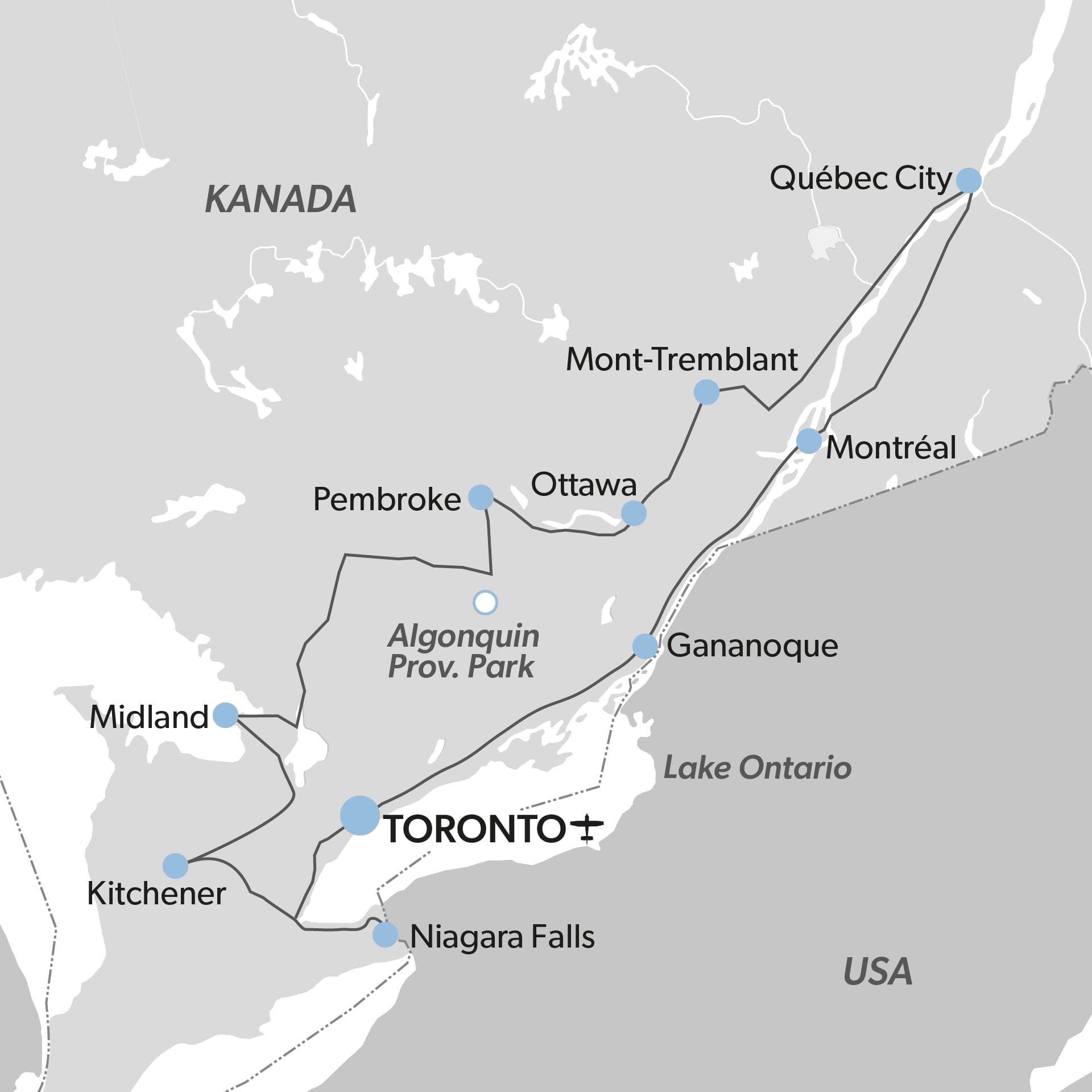 Entdecke die Höhepunkte in den Provinzen Ontario und Québec! Deine Reiseroute enthält zahlreiche bekannte Stationen, wie das multikulturelle Toronto, das französisch geprägte Montréal, das historische Québec City, die Hauptstadt Ottawa sowie das einmalige Naturschauspiel der Niagarafälle. Naturliebhaber und Outdoor-Enthusiasten kommen im Algonquin Park und in der Region Mont-Tremblant voll auf ihre Kosten.
