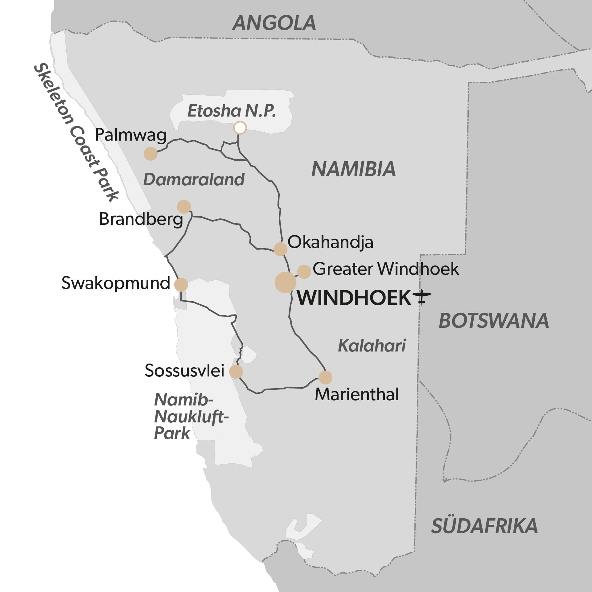 Die angrenzenden Länder Angola, Botswana, Südafrika und Sambia sind von Namibia aus auf dem Landweg zu erreichen.