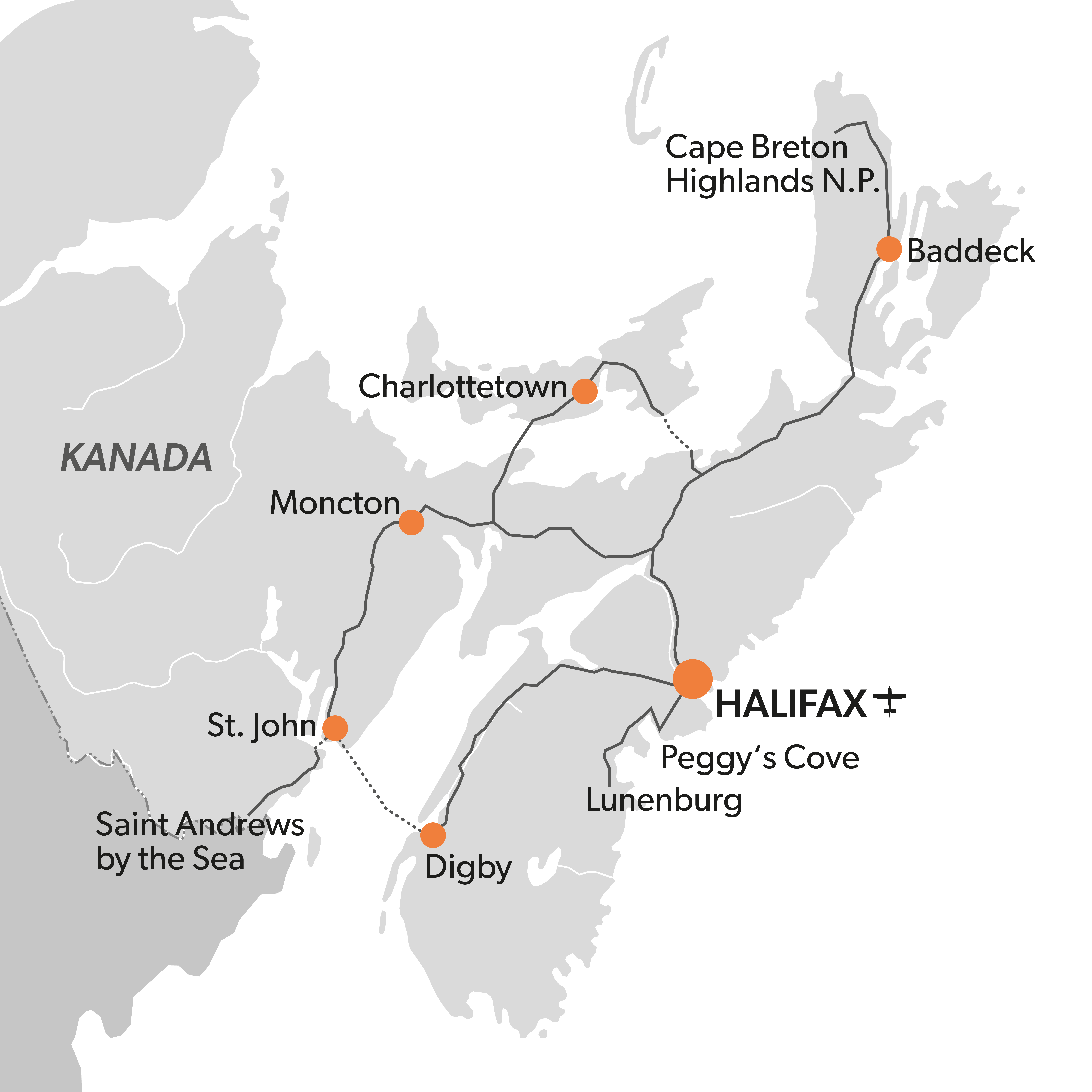 Entdecken Sie die einzigartige Lebensart der Maritimes und genießen Sie die entspannte Atmosphäre von Land und Stadt. Tauchen Sie ein in das schottische, akadische und indigene Erbe der Atlantikprovinzen. Besuchen Sie malerische Fischerdörfer in Nova Scotia und bestaunen Sie die raue Küstenlandschaft New Brunswicks an der Bay of Fundy. Erleben Sie atemberaubende Ausblicke, spannende Abenteuer und charmante Städte. Zu den Höhepunkten zählen Prince Edward Island, Cape Breton, der Bras d’Or Lake, St. Andrews by-the-Sea, Oak Island und der spektakuläre Cabot Trail.